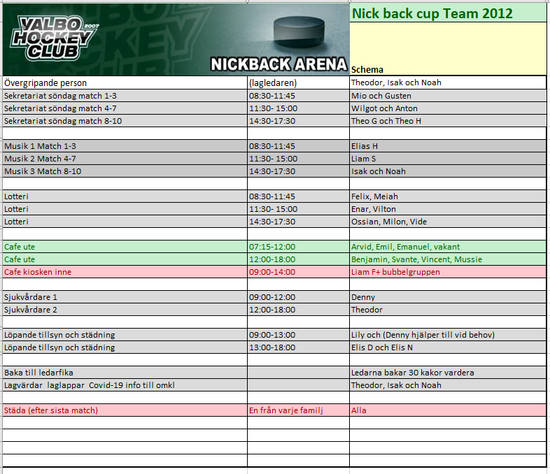 Hejsan, nu är det nära till våran första version av NB-Cup 2021. Vi samlas kl 08:15 på söndag 3/10 i NickBack Arena (oberoende starttid på match). Spelschema mailas ut separat. Ansvarfördelningen har skickats ut tidigare och kommer även att vara uppsatt på NickBack på söndag. För er som säljer lotter kommer det att finna 2 lottringar och ni avgör om båda behöver användas. Vill ni kika hur cupen fungerar går det utmärkt att åka och titta när U11 har sin cup nu på lördag 2/10 (de har heldag), exempelvis om man vill se hur de förberett utecafé etc. Bubbelgruppen kommer att vara på plats och hålla i trådarna. Vi hälsar följande föreningar välkomna till Valbo och NickBack Cup-2021 Brinkens IF (2lag) Täby HC (2lag) Östervåla IF (1lag) Brynäs IF (1lag) LAGUPPSTÄLLNINGAR (med reservation för eventuella ändringar) MV=målvakt. Målvakterna kommer överens med med lagledare om vem som står vilken match. Valbo 1 Lagledare: Patrikl Ek och Erik Forsberg Elis Dahl Emil Ek Enar Elfsberg Arvid Forsberg Benjamin Jonsson MV Mussie Kidane MV Anton Sabel MV Liam Sjösten Valbo 2 Lagledare: Fredrik Stefansson och Marcus Arnemark Ture Arnemark MV Wilgot Bergkvist Lily Edgren Denny Engström Mio Lindblad MV Wilton Norman Isak Stefansson Emanuel Svärd Valbo 3 Lagledare: Fredrik Gottby och Fredrik Westin Milon Basnet Meiah Carlsson Felix Dalnor Westin Noah Gottby MV Theo Höglund MV Gusten Kranz Vide Liv Elis Nieminen Valbo 4 Lagledare: Stefan Söderlund Liam Forsén Theo Gillberg MV Ossian Grönberg MV Svante Gustafsson Elias Hessler Theodor Söderlund MV Vinzent Wolf Tillsammas gör vi detta möjligt för våra barn! Mvh Ledare och Bubbelgrupp