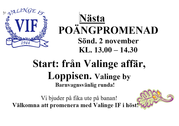 Priserna hämtas på nästa poängpromenad söndagen den 2 november från Loppisen i Valinge affär.
