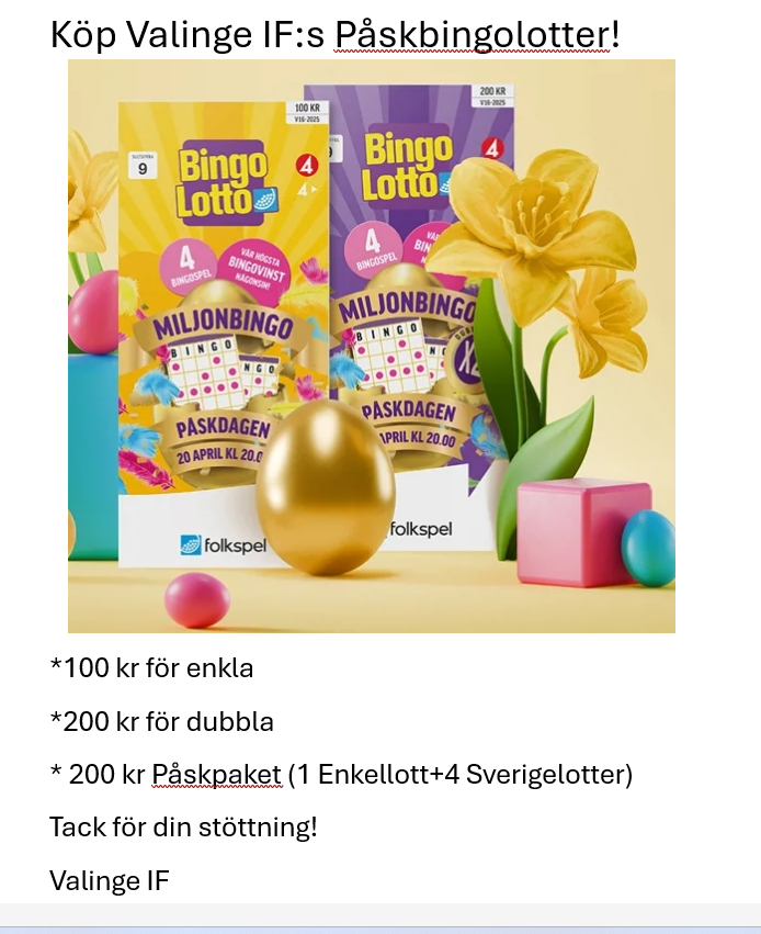 Nu närmar sig påsken med stormsteg och inför den säljer Valinge IF Påskbingolotter för Påskdagen Bingolotto: