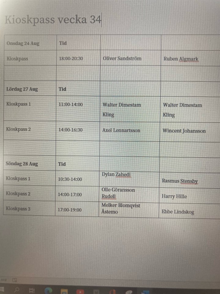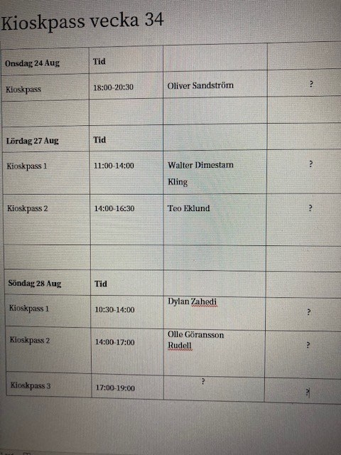 Hej! Vecka 34 är det dags för P-15 att bemanna kiosken på Claesborg igen. Vi bifogar ett schema här där de som inte stod i kiosken sist nu har fått ett pass. Kan man inte den tiden som är tilldelad så får man själv hitta en lösning på byte under samma vecka. Som ni ser är det några luckor som ännu inte är bemannade, skriv i kommentarerna om ni har möjlighet att boka upp er. Är inte alla pass fyllda senast 14/8 så behöver bemanning av dessa lottas. Önskar er en fortsatt härlig sommar. Mvh Sofia och Anna P-15 3 aug 2022 8kommentarer