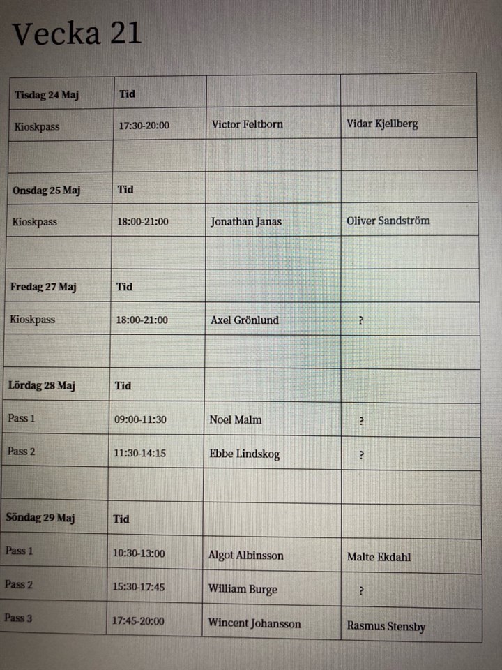 Hej alla föräldrar. Då det var dåligt med anmälningar till att hjälpa till att bemanna kiosken vecka 21 har vi nu lottat och så här blir bemanningen. Kan man inte det pass man blivit tilldelad får man själv fixa ersättare. Tisdag 24/5 17.30-20.00 Victor Feltborn och Melker Blomqvist-Åstemo Onsdag 25/5 18.00-21.00 Oliver Sandström och Jonathan Janas Fredag 27/5 18.00-21.00 Vidar Kjellberg och Axel Grönlund Lördag 28/5 9.00-11.30 Johan Litstrand(Neo) och Noel Malm Lördag 28/5 11.30-14.15 Olle Göransson Rudell och Ebbe Lindskog Söndag 29/5 10.30-13.00 Algot Albinsson och Malte Ekdahl Söndag 29/5 15.30-17.45 Harry Hille och William Burge Söndag 29/5 17.45-20.00 Wincent Johansson och Rasmus Stensby Mvh Sofia och Anna P-15 20 maj 2022 19kommentarer