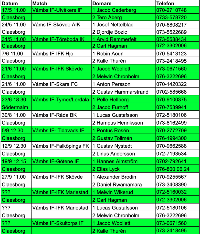 Här kommer listan på de matcher våra grabbar ska döma. Alla kommer att döma minst en match var. De tre sista matcherna är datum och tid ännu inte satt men kompletteras så snart allt är klart. Att tänka på: - Egen pipa medages. - På plats en halvtimma innan matchstart för att träffa upp och presentera sig för ledarna i båda lagen. - Se till att få en domarkvittens underskriven av ansvarig ledare för Våmbslaget. Denna kvittens lämnas sedan till Tobbe och utbetalning sker innan midssommar för de som dömer vårsäsong och i september för höstens matcher. - Kan ni inte det datum ni är uppsatt, byt med en kompis och meddela Tobbe. Kallelse skickas ut en vecka innan domaruppdraget.