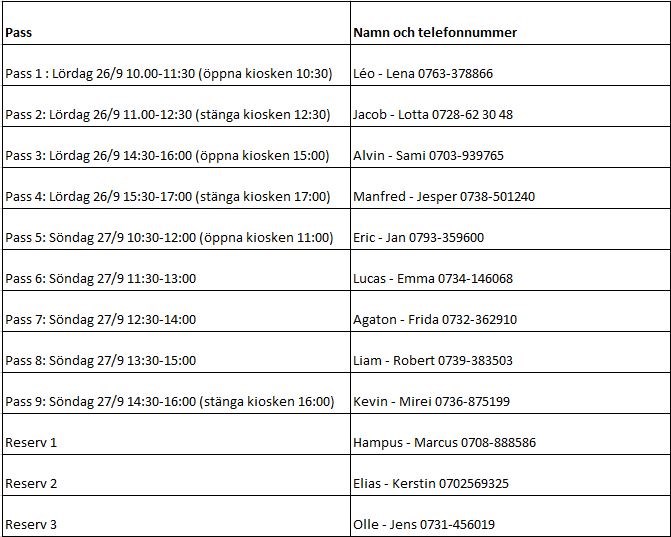 Kioskschema för V39 2020. Om man inte kan får man byta med någon annan