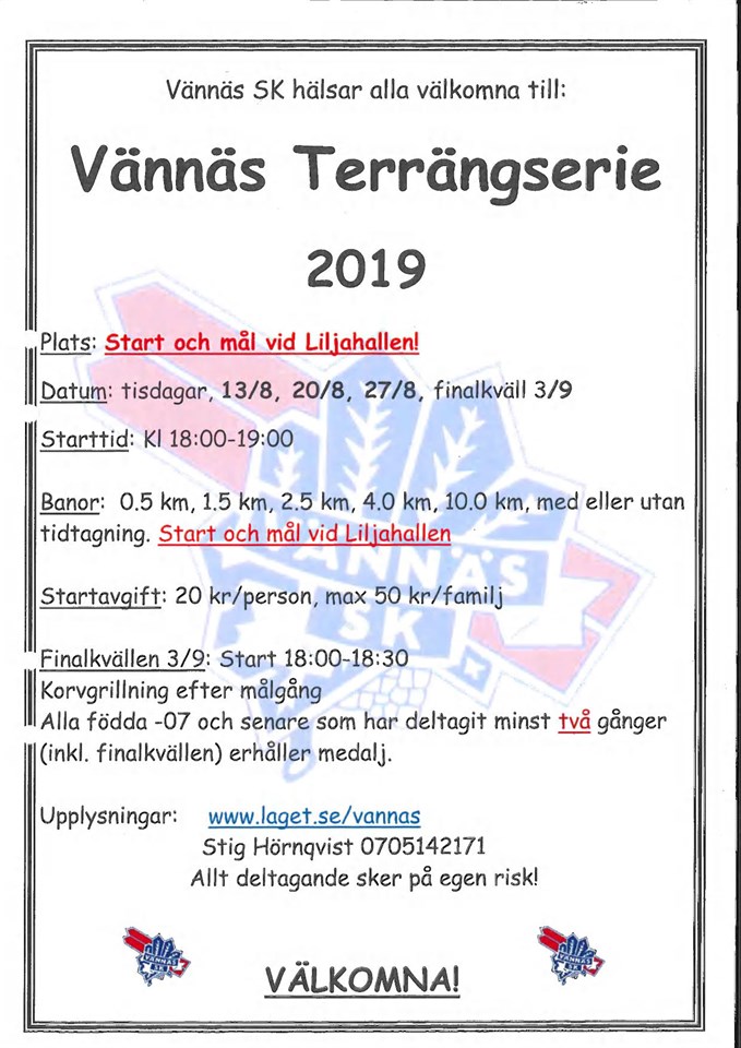 Vännäs SK hälsar välkommen till Vännäs Trail När? 25 maj Var? Liljahallen, Vännäs Sträckor: 1,5 km för barn 0-12 år, start 11:00 3 km för ungdomar 13-16 år, start 11:30 10 km, start 12:00 Samtliga sträckor i skogsterräng Mer information kommer på vår hemsida: www.laget.se/vannas Möjlighet till efteranmälan på plats finns till förhöjd startavgift fram till en timme före start Välkomna! Stig H. 0705142171 stig.hornqvist@svevia.se