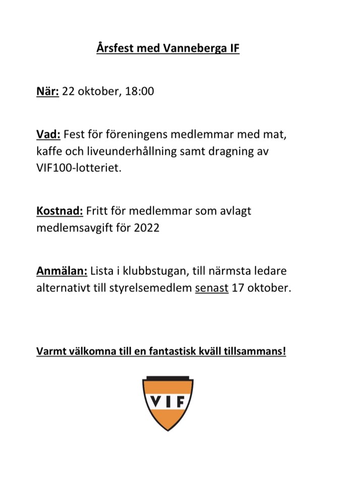 Årsfest Det börjar bli dags att avsluta ett lyckat 2022. Därför bjuder föreningen in till den årliga årsfesten. Till alla som på något vis hjälp till under året ska verkligen ta del av denna kväll. Det är ett litet tack till oss att ge tillbaka för det ni gör ideellt för klubben. Där kommer även iår vara en del spelare som tackar för sig så dom är värda en kväll tillsammans med oss alla. Det kommer bli en mycket trevlig kväll med priser & mycket annat & det är även iår duktiga Jocke & Matte som står för underhållningen. Skriv upp er nere i klubbstugan så snabbt ni kan ta gärna med era respektive till denna kväll. Har man inte möjlighet att ta sig ut i klubbstugan ta då kontant med någon annan i föreningen som kan skriva upp er. Bastusäsong Jörgen Stensson har dragit igång vinterbastun säsongens tider är följande 14:00 & framåt alla lördagar. Beroende på hur mycket folk där är så ser vi när vi stänger bastun om lördagskvällarna. Cykla gärna ner snacka lite skit & ta något gott att dricka & lägg en peng i Jörgens kassa för er som inte har årskort. Badtunnan kommer att vara tänd på följande tider fram till jul därefter släpper vi nya tider. Lördag 8 Oktober Badtunna. Lördag 19 November Badtunna. Lördag 10 December Badtunna. Heja Vanneberga!