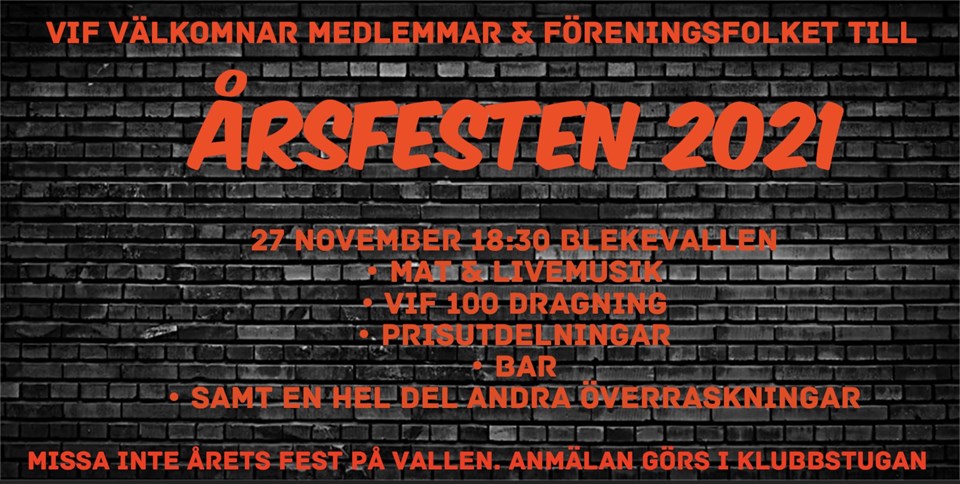 Efter snart två dryga år är de dags för årsfest igen. Festen är såklart alla värda lite extra efter alla dessa prövningar som våran förening har ställts för som vi klarat oss ur med bravur. Under denna kväll ser föreningen gärna att alla ni spelar verkligen tar med era respektive. Anmälan görs i klubbstugan på anslagstavlan direkt innanför dörren! Heja Vanneberga!