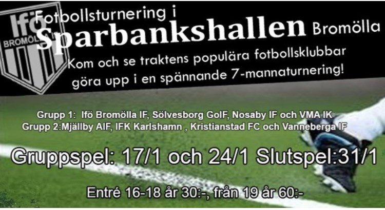 Precis som bilden beskriver det, Kom & se traktens populäraste fotbollsklubbar. Det är mörkt & trist & gräset har inte blivit grönt på vårat vackra Blekevallen än. Vad ska ni göra då? Jo ni ska bege er till sparbankshallen i Bromölla fredagen den 24/1 för då spelar vi en 7-manna tunering i Bromölla och erat stöd kommer såklart bli avgörande då vi möter både division 2 motstånd men även allsvensk motstånd i form av Mjällby AIF. Klä er i orange/svart & dyk upp! 18:30 IFK Karlshamn - Vanneberga IF 19:30 Vanneberga IF - Kristianstad FC 20:00 Vanneberga IF - Mjällby AIF Fortsätt kika in på hemsidan. Under dom kommande veckorna det kommer det dyka upp en sen & mycket fin julklapp för oss orange/svarta, håll utkik! VI ÄR VANNEBERGA! Heja Vanneberga!