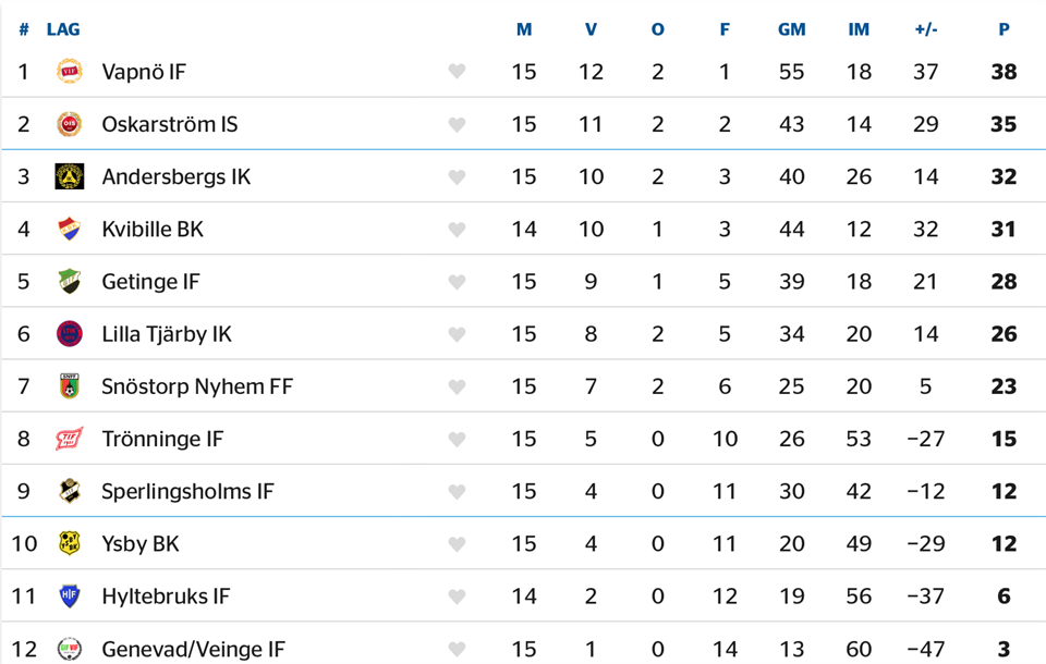 Vapnö hade inga stora bekymmer med att vinna dagens match mot jumboplacerade Genevad/Veinge. Spelet kanske inte var det snabbaste under året inledningsvis, lite semesterfotbollsvarning. 1-0 målet dröjde dock inte längre än till den 19 minuten då Casper Karlsson spelade in bollen och den kunde rakas in av Linus Claesson. Bortalaget kom tillbaka efter lite taffligt försvarsspel och kvitterade i den 27 minuten. Anton Jönne kunde dock se till att det var halvtidsledning för hemmafavoriterna med 2-1, efter fin assist av Robin Berggren. Matchen avgjordes i början av andra halvlek med två snabba mål av Rasmus Levander, och den definitiva spiken i kistan satte Vilgot Hafström i slutet. Även denna omgång var resultaten med Vapnö då Oskarström spelade oavgjort mot Snöstorp/Nyhem, och Kvibille förlorade mot Andersberg. Vapnös serieledning är därmed tre poäng före Oskarström. Tätt därbakom ligger också Kvibille och Andersberg och lurar. En kul och spännande höst väntar, inte minst nästa helg då Kvibille kommer på besök fredagen den 23 augusti klockan 1830. Välkomna att bevittna den bataljen på plats på fina Vapnö IP.