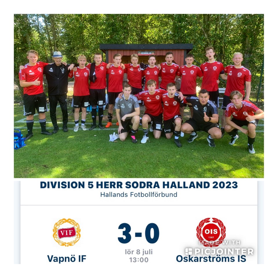 En stabil insats under hela matchen mot Oskarströms IS gav en välförtjänt seger i sista matchen innan uppehållet. På en härligt grön och fin A-plan hade Vapnö matchen under kontroll i hela första halvlek, dock utan att hitta de allra vassaste chanserna. Inte heller Oskarström skapade något speciellt, vilket fick åskådarna att undra om det utspelades en klassisk 0-0 match framför deras ögon. Så blev det inte då Vapnö efter 5 minuters spel i andra halvleken tog ledningen, efter det att i Vapnö comebackande Avdi Dogani grävt sig fram längs kortlinjen och serverat Hugo Neborg som distinkt tryckte in bollen. Och han var inte nöjd med det, utan bara några minuter senare skarvade han in sitt andra mål till en 2-0 ledning, varvid matchen kändes avgjord. Resten av halvleken kontrollerades väl, men lite semesterfotboll blev det kanske i slutet. I matchens 80 minut tyckte Vilgot Hafström att det var dags att sätta punkt och han tryckte av, varefter bollen via en försvarare rasslade in i nätet. I och med dagens vinst, den tredje i rad, har laget på ett förtjäntsfullt sätt tagit sig tillbaka lite högre upp i tabellen efter en tid i våras då man hade så förtvivlat svårt att få in bollen. Och det får betecknas hur rättvist som helst såsom matcherna sett ut under året. Nu väntar lagfest och ett välförtjänt uppehåll för spelarna. För styrelsen och övriga frivilliga börjar dock jobbet på riktigt. Redan i morgon kommer grävmaskinen in på A-planen för att gräva för vår nya läktare. Förhoppningsvis är den på plats till nästa hemmamatch. Även om inte läktaren blir jättestor, kommer den bli ganska dyr. Vi har egentligen inte riktigt råd att göra den färdig som läget är nu. Vi har fått tacksam hjälp av några privata sponsorer redan, men hoppas att många fler av våra härliga supportrar och medlemmar kan tänka sig att gå in och sponsra bygget lite. Det gör man smidigast via denna länk där man på ett enkelt sätt kan swisha. Om det finns något företag som kan tänkas gå in med någon tusenlapp eller mer, får ni hemskt gärna maila en rad till info@vapnoif.nu Nu önskar vi er alla en riktigt härlig sommar!