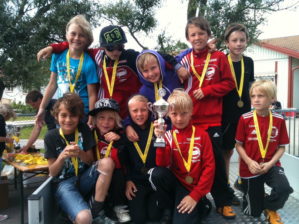 Så är årets Åsa Cup tillända. Det var ett gäng trötta men lyckliga lirare som kom hem igår. Trötta efter mycket bus och många matcher. På fredagen var det bara 02-matcher. En oavgjord och två segrar senare var vi tvåa i vår grupp och vidare till A-slutspel. Sedan var det bara lek efter maten. Regnet gjorde att det inte blev någon grillning vid havet, men det gjorde inte grabbarna något eftersom de hade kul ändå. Till slut lyckades de också somna... På lördagen var det dags för både 03-matcher och finalspel i 02-serien. detta gjorde att vi var tvungna att dela upp styrkan, då vissa matcher gick samtidigt. Vi valde att satsa lite på sluspelet i 02-serien. Därför fick inte några sk "stöttespelare" spela i 03-laget. Det gick riktigt bra ändå. Visserligen blev det tre förluste, men också en vinst. Jättebra att flera fick stiga fram och visa att de är riktigt bra bollirare. Det var mycket nyttigt för framtiden. Bra jobbat där killar! För 02:orna började det med en 8-delsfinal mot BK Lobo. Det kändes tryggt efter en tidig ledning. Vi var inte särskilt oroliga även när de reducerade strax före slutet. Vinst med 4-3- Då blev det kvartsfinal mot Bergdalens IK. Lite mer ovisst och en jämn match, men ändå en rättvis seger med 3-2. Fantastiskt bra! Då stod vi plötsligt på eftermiddagen och skulle spela semifinal. Vi visste att vi blivit sämst 3:a i cupen, eftersom det inte skulle spelas match om tredje pris. Vi mötte Tölö IF. Ett stabilt lag som också tog ledningen tidigt och blev extra uppumpade. Men sakta så segade vi oss ikapp och kvitterade i första halvlek. Andra halvlek bestod i ett otroligt kämpande. Tölö var starka och vi hade vinden emot oss. Grabbarna slet! Trodde att de skulle vika ned sig helt när Tölö gjorde 2-1, men icke. De fortsatte att slita, men hade jobbigt att få upp bollen på Tölös planhalva. När matchklockan tickade på full tid, skickade vi iväg ett långskott som letade sig in! 2-2 och matchen skulle avgöras på straffar. Trodde vi... Domaren blåste igång igen och lät spelet fortgå i ytterligare en dryg minut, som Tölö mycket snöpligt utnyttjade med matchens sista spark, och därmed vann med 3-2. Killarna kämpade otroligt bra, och var rejält trötta efter matchen. Inte så mycket hängande huvuden heller, då vi tror att de innerst inne var väldigt nöjda. Det var trots allt 34 lag i P10 spelet, och vi har kommit tre. Före lag som Falkenbergs FF och IFK Göteborg m.fl. Så med en fin pokal att ställa i klubblokalen och medaljer till lirarna åkt vi hem riktigt nöjda och trötta. Det skall också sägas att Tölö vann finalen mot Kinna IF med 4-2, så det var inget dåligt lag vi pressade in i kaklet. Tack till alla föräldrar som på något sätt bidrog till den lyckade resan. Ingen nämnd och ingen glömd, men måste ända ge en eloge till Nina och Dan Stålnacke, som ändrade tiden för sitt giftemål för att det inte skulle krocka med cupen! Rätt prioritet eller hur! Grattis till er båda och skönt att bara behöva skriva ett efternamn till Anton... Ha nu en riktigt skön sommar med mycket bad och ledighet. Glöm inte att kicka lite boll ibland. Vi ses igen torsdagen den 2 augusti, då vi kör igång träningen som vanligt igen. Hälsningar Ledarna