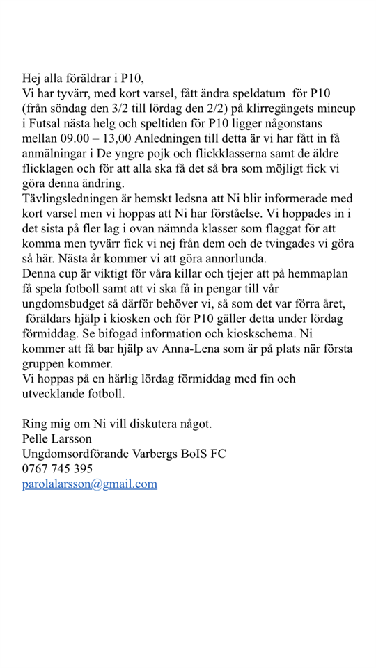 RapporteraTack alla som kan ställa upp och hjälpa till i kiosken imorgon. 08.30-13.00: Sara, Malin, Tony, Jonnamay och Bertil. 10.30-13.00: Charlotte, Ellinor och Mikael. Vi behöver fortfarande fylla pass två (kl 10.30-13.00) med två personer. Daniel Wide har sagt att han kan pass 1 om någon där kan tänka sig att byta till pass 2. Syns imorgon! 😀