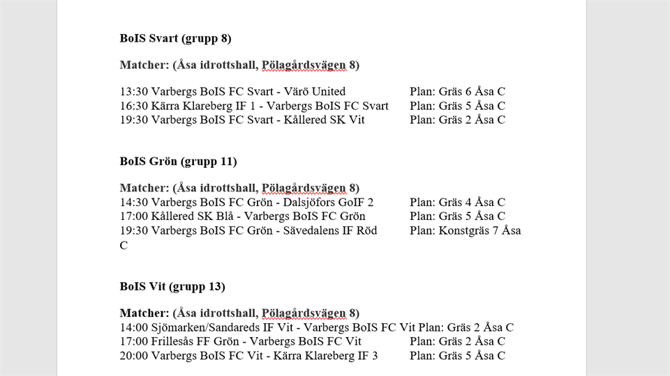 Hej! Som utlovat kommer här bilar till och från Åsa fredag-lördag. Samlingstid på lördag är helt beroende på resultatet efter fredagens matcher och vi kommer meddela er detta sent fredagkväll. Se därför till att få grabbarna i säng i tid ;) Vi kommer låta killarna få låna med sig matchstället hem över natten fredag/lördag och det är av stor vikt att de kommer ombytta i detta på lördagmorgon! Packa därför med vanliga kläder för vi kommer samla in ställen efter lördagens matcher. Vill ni kika på när matcherna kan tänkas bli är länken till cupsidan: https://www.procup.se/cup/33492.htm Fredagens matchtider och planer har i vissa fall ändrats men vi väljer av praktiska skäl att ha kvar samlingstiderna som vi har gått ut med. Se bifogad bild för vad som gäller för er son. Frågor besvaras som vanligt av Linda. Ha en fortsatt fin dag! Fredag från Varberg Energi Arena 11:00 Markus – Adam, Alex, John, Mike Fredag Varberg Energi Arena 11:30 Pär – Aulon, Iggy, Ville Thomas – Charlie, Leon Therese Algotsson – August, Edvin, Eliot, Vincent Magnus Töllborg – Emil, Noel och Salomon (utgår norr om stan) Åker direkt till Åsa Alfred, Erik, Enrique, Harry, Loke, Ludwig, Valter Hem Åsa fredag (resterande åker hem själva) Glenn Karlsson – Noel, Salomon Annika Mauritzson – Emil, Ludwig Markus – Adam, Alex, John, Mike Thomas – Aulon, Charlie, Iggy, Ville Therese Algotsson – Leon, Vincent Kimmo Eskelinen – Harry, Alfred Lena Wehlin – August, Edvin, Eliot Lördag Varberg Energi Arena lag svart Markus - Adam, John, Mike Lördag Varberg Energi Arena Lag vit Alex - Aulon, Charlie Lördag Varberg Energi Arena Lag grön Thomas – August, Leon, Eliot Glenn Karlsson - Noel, Salomon (utgår norr om stan) Åker själva till Åsa Alex, Alfred, Edvin, Emil, Enrique, Erik, Harry, Loke, Ludwig, Valter, Ville, Vincent