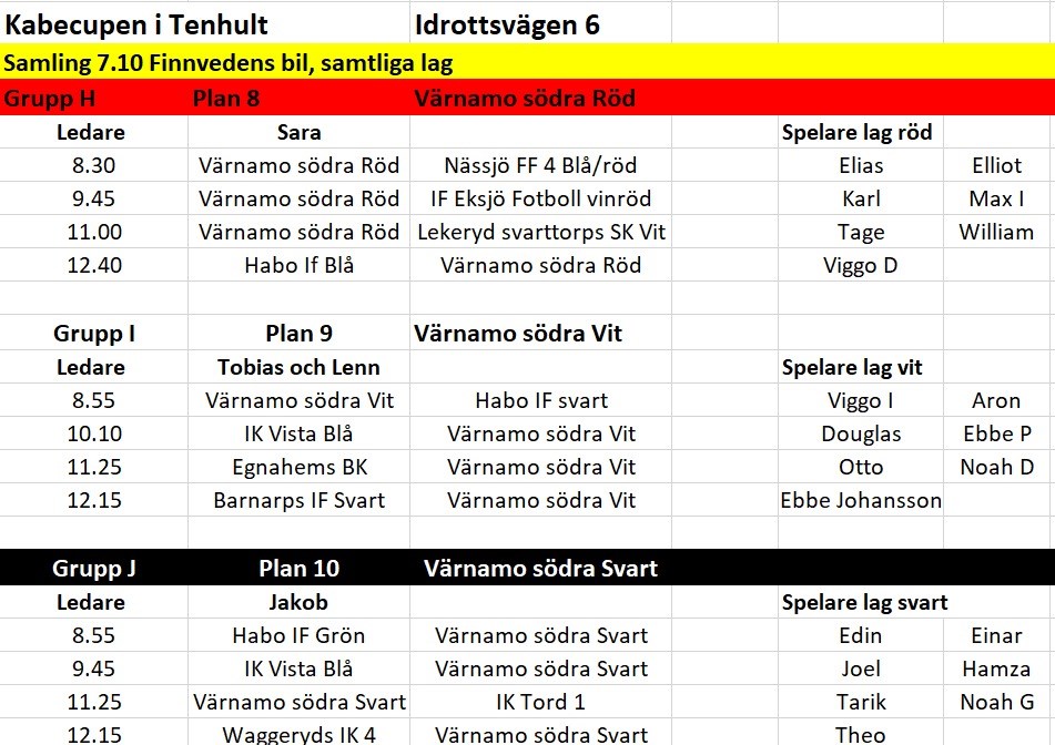 På lördag åker ett gäng till Tenhult, idrottsvägen 6, det är sista cupen innan semestern. Ska bli riktigt kul, vädret ser lovande ut! Bild visar lagindelning och matchtider. För gemenskapens skull åker vi ihop. Alla lag samlas 7.10 vid Finnvedens bil. Inga omklädningsrum finns tillgängliga för ombyte. Här hittas mer information, bland annat anvisning till parkering: Tenhults idrottsförening, Kabecupen Om ditt barn blir sjuk, hör av dig så snart som möjligt till en ledare. Då hinner vi ge chansen till någon annan som också gärna vill åka på cup. Den här informationen har gått ut på WhatsApp också. Du som ännu inte har anslutit dig till gruppen kan göra det via denna länk: Vår WhatsApp-grupp Om det inte funkar kan du höra av dig till en ledare, så får vi försöka hjälpa till. Syftet med gruppen är att vi enkelt kan nå varandra. Men gäller det frånvaro/närvaro när anmälningstiden till en träning gått ut, tas istället en direktkontakt med en ledare. Våra telefonnummer finns här på lagets sida. Vi ses på lördag eller på tisdagens träning!