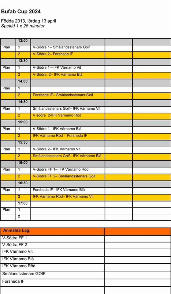 Imorgon kör vi samlingen 12.15 jämte planen vid "betongtrappan" istället. Vi är osäkra om omklädningsrummen är lediga direkt då de är cup på förmiddagen med. Skickar med spelschemat, grabbarna får reda på imorgon vilket lag de tillhör. Men båda lagen har sin första match kl 13.00. Vi ses imorgon, taggade och redo!