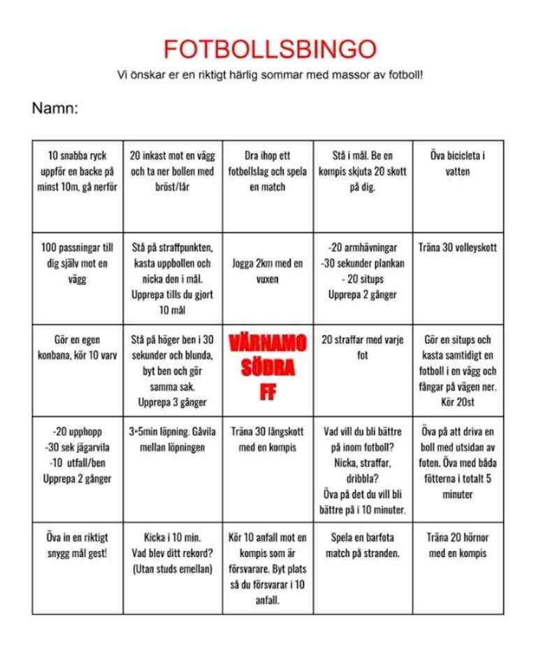 Vi tackar för en härlig vår, med massa roliga matcher och mycket fotboll för grabbarna! I veckan gav vi ut ett fotbollsbingo på träningen som vi gärna vill ha in efter sommaren. De finns en och annan vinst att tävla om, så hoppas grabbarna blir extra taggade på att göra fotbollsbingot! Så glömmer ni bingot hemma i sommaren så har ni det här, ta en screenshot och börja kryssa! Och för er som vill att jag mailar ut ett skriv er mailadress här under. Vi önskar er en härlig sommar! /Tränarna P-13 2 jul 2023 1kommentar