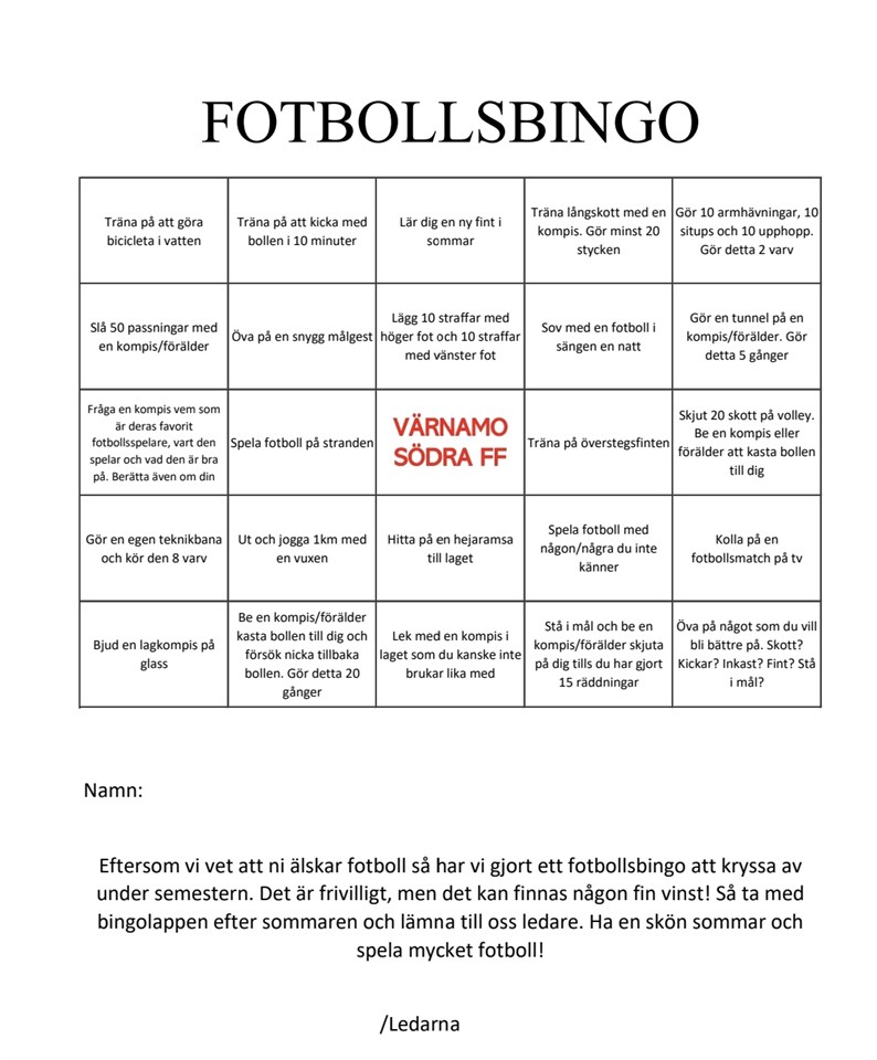 Tusen tack för dagens roliga föräldramatch! För er som inte var på träningen delades ett fotbollsbingo ut, se bild. Så försök fylla brickan i sommar, ta med er den på första träningen efter sommaren och va med och tävla om fina priser! Vill ni hämta en bingolapp så kontakta Emma på 073-0572010. Ha en riktigt härlig sommar! /Ledarna