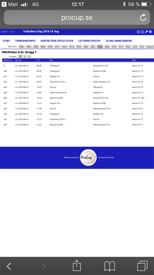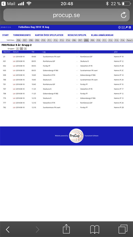 Grupp 2 spelar sin första match kl 09:55 och därmed ändrad samlingstid till 09:15 på Hamre IP plan 17. F-10 15 aug 2018 5kommentarer