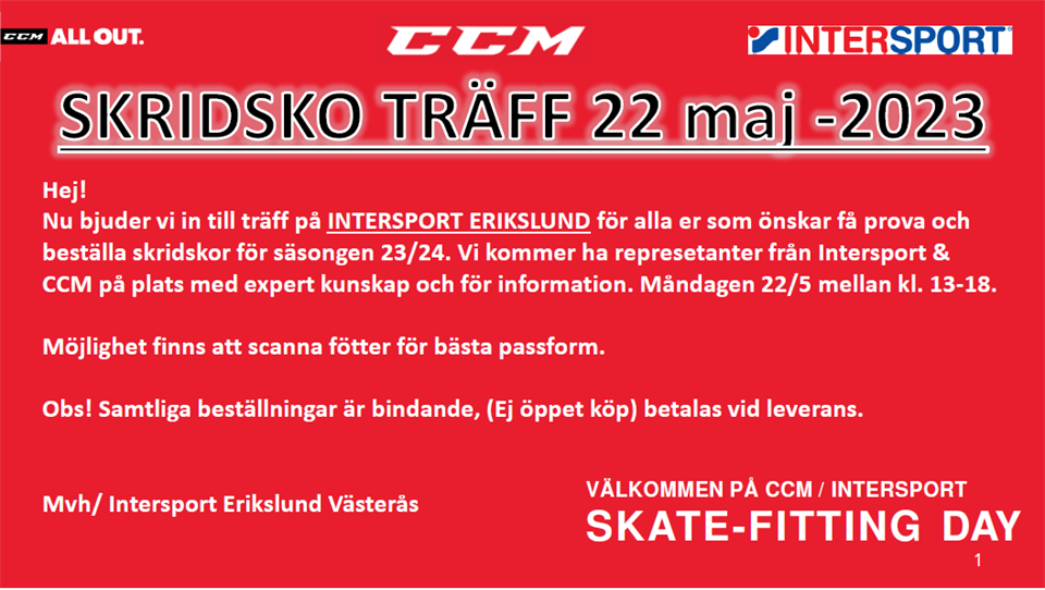 Hej! CCM och Intersport Erikslund bjuder in till en skridskoträff den 22:a maj.kl 13-18. För bästa utprovning och rådgivning finns representanter från CCM på plats. Du kan även förbeställa andra skydd från CCM. Ni finner mer info här: Inbjudan och info från Intersport Länslag Pojk 16 maj 2023 0kommentarer