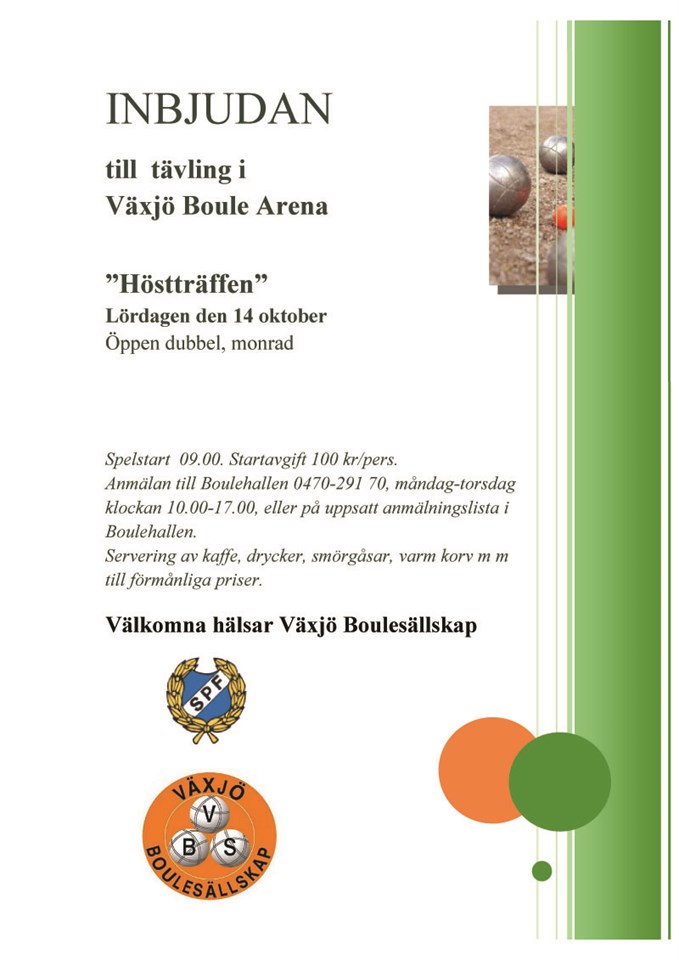 Inbjudan och anmälan till tävling i Växjö Boule Arena Växjö Boulesällskap 16 okt 2023 0kommentarer