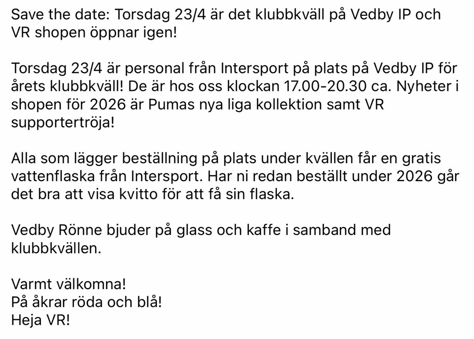 Klicka på bekräftelselänken i det mejl vi skickat dig för att börja ta emot uppdateringar från Vedby-Rönne IF Flickor 17/18/19.