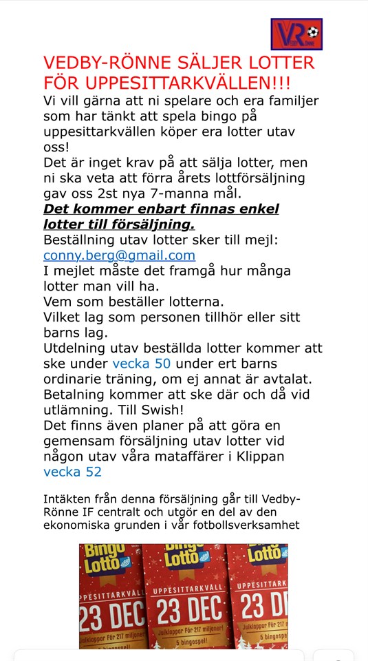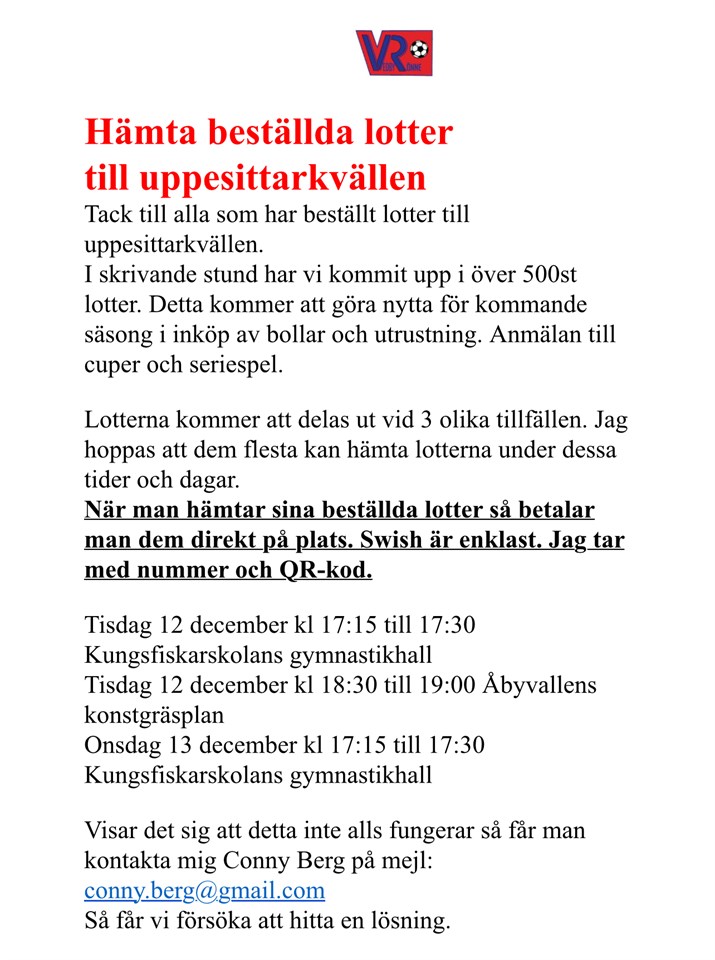 Hej alla! Tyvärr måste vi ställa in morgondagens fotbollsträning på grund av sjukdom. Vi ses nästa vecka på julavslutningen & töserna som spelar då får gärna ha tomteluvor/annat juligt om dem vill. Bingolotterna bifogar vi bild med information för er som beställt vilka dagar, tider & plats det går att hämta på. Vi ses nästa vecka! :) Med vänlig hälsning, Sarah & Sofie Flickor 17/18/19 11 dec 2023 3kommentarer