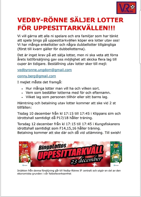 Nu har ni möjlighet att beställa Bingolotter inför uppesittarkväll den 23/12. Inget tvång att beställa men en möjlighet för föreningen att tjäna lite extra pengar ifall ni väljer att handla genom oss.