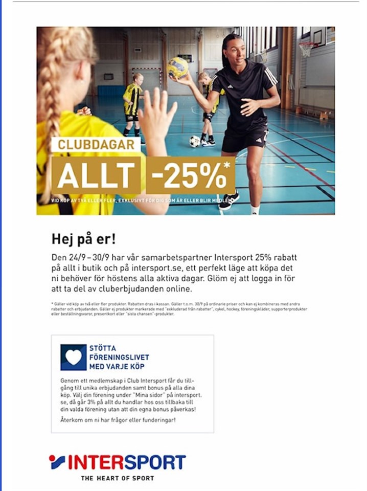 Mellan den 24/9–30/9 har vår samarbetspartner INTERSPORT 25% rabatt på allt i butik och på intersport.se, ett perfekt läge att köpa det ni behöver för höstens alla aktiva dagar. Gäller för dig som är eller blir medlem i Club INTERSPORT. Glöm ej att logga in för att ta del av cluberbjudanden online. Genom ett medlemskap i Club INTERSPORT får du tillgång till unika erbjudanden samt bonus på alla dina köp. Välj din förening under ”Mina sidor” på intersport.se, då går 3% på allt du handlar hos oss tillbaka till din valda förening utan att din egna bonus påverkas! PF-19/20 19 sep 2024 0kommentarer
