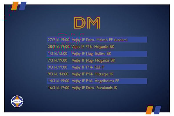 Nu börjar fotbollssäsongen smyga igång så sakta och denna veckan börjar DM. Våra damer, junior-lag herr, P16, F14 och P14 är lagen som ska lira om slutspelsplatser. Kom gärna upp till konstgräset och heja fram våra lag!