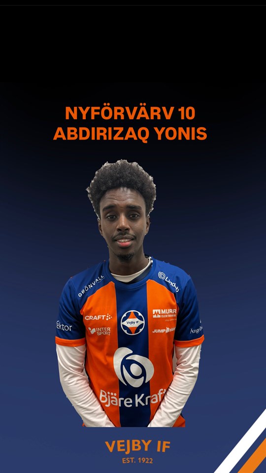 Vi fortsätter hälsa nya spelare välkommen till Vejby IF och denna gång är det Abdirizaq Yonis som vi välkomnar från ÄFF U19. Teknisk och snabb ytter som vi är glada har valt att fortsätta sin utveckling i Oranje. Välkommen Abdi!