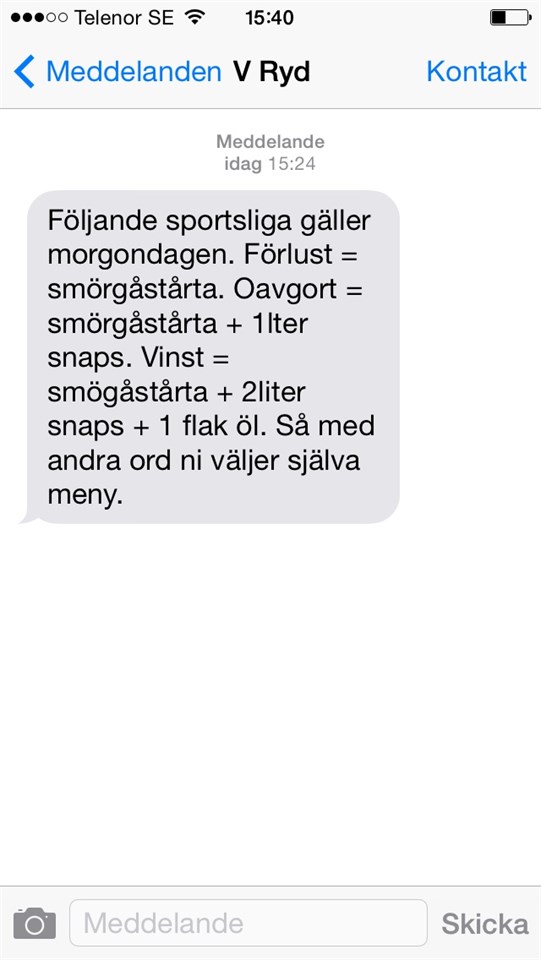 Av årets alla tusentals sms är ju följande sms från basen i stödföreningen helt klart ett sms för topp-10listan. Så om någon overkligt nog skulle behöva lite extra tändvätska inför matchen tycker jag ni ska läsa smset. Anser ni att ni inte behöver en extra morot tycker jag ni ska läsa ändå. Så ni förstår varför Björn eventuellt blir skogstokig likt Christer Pettersson & kommer jaga er över hela Vildsvinsvallen om han anser att någon av er fuskar.