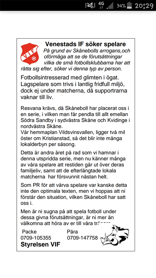 Hej! Efter stor övervägande och fundersamt kommer denna säsongens b-lag att utgå ur serien. Förklaring till detta är många olika faktor. Vad som sker 2015 och alla andra frågor, får komma vid ett senare tillfälle. Jag tackar samtliga spelare under 2013 och 2014 som ställt upp och lirat. Med min filosofi fotboll är kul, inget gnäll, spela till domaren blåser så har jag fått många minnen med mig. Nu hoppas jag så många så möjligt, tar ett jävla tag och ror loppisen i hamn detta året. Vi syns på Vildsvinsvallen M V H Jerry