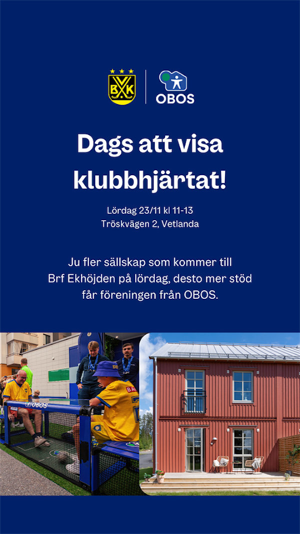 Lördagen 23 november kl. 11:00–13:00 bjuder OBOS in dig och dina nära & kära till en dag full av rörelseglädje, gemenskap och familjeaktiviteter här i Vetlanda! Och bäst av allt - genom ditt deltagande stöttar du även din förening ekonomiskt och bidrar till dess verksamhet. Win win helt enkelt!
