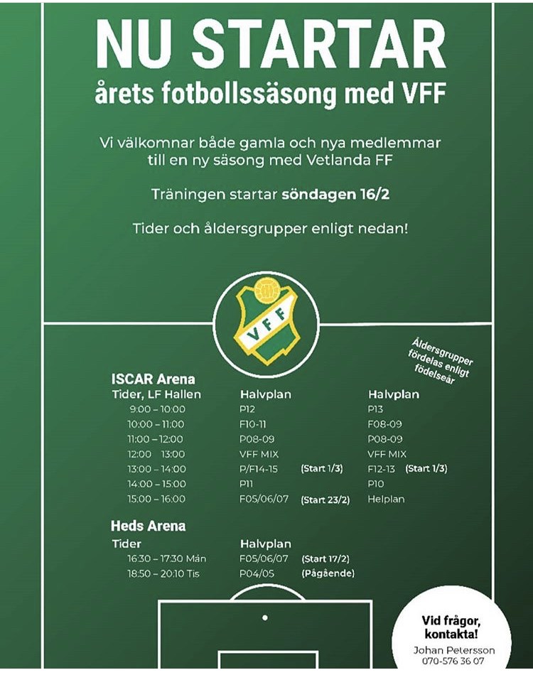 Med anledning av rådande läge kring Corona har vi idag, lördag 14 mars, beslutat att vi ställer in samtliga inomhusträningar från och med söndag 15 mars. Detta sker på obestämd tid och vi följer utvecklingen framöver. Bakgrunden till beslutet är att vi vill bidra till att minska risken för smittspridning i samhället. Träningen utomhus kan fortgå då smittospridningen är lägre utomhus (som beslutet är nu), men följande punkter är viktiga att ta hänsyn till; * Stanna hemma om du känner dig förkyld eller hostar. Ta inga risker * Kom ombytt, duscha hemma och ta inga onödiga närkontakter. / Styrelsen VFF