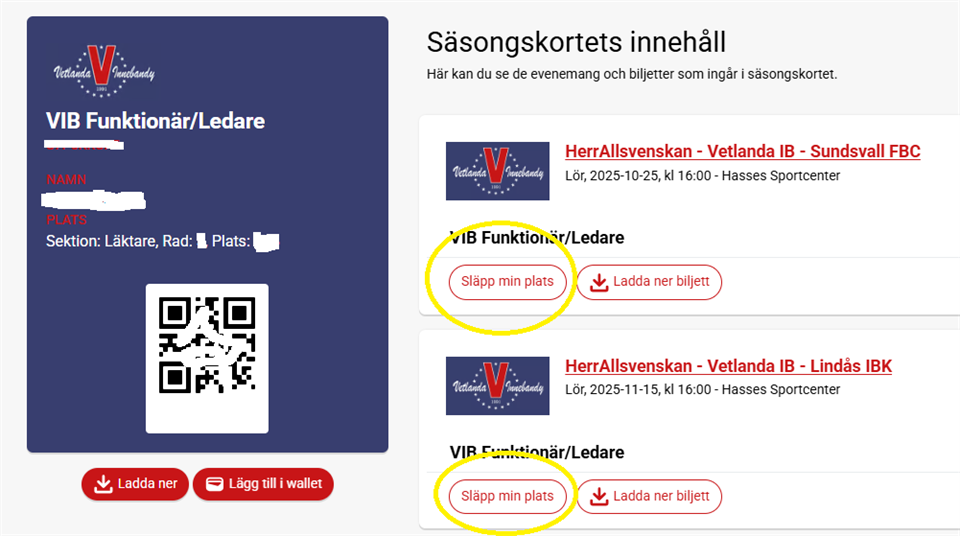 Är du säsongskortsinnehavare eller funktionär/ledare och inte har möjlighet att gå på någon eller några av matcherna så är det av stor vikt att du loggar in på länken nedan, klicka sedan på visa alla säsongskort, klicka därefter på ditt säsongskort, under respektive match finns en knapp "Släpp min plats". Då släpps din sittplats för den aktuella matchen till försäljning och på så sätt minimerar vi antalet tomma sittplatser.