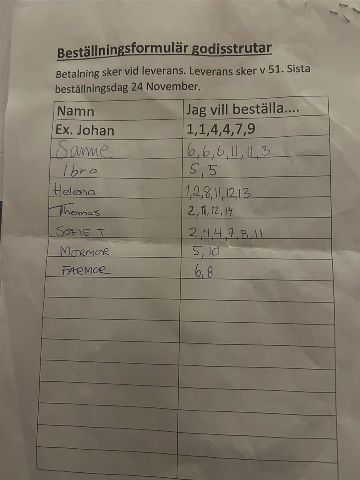 Sammanfattat alla godisbeställningarna men vems är denna? 😊 F-13 12 dec 2025 0kommentarer