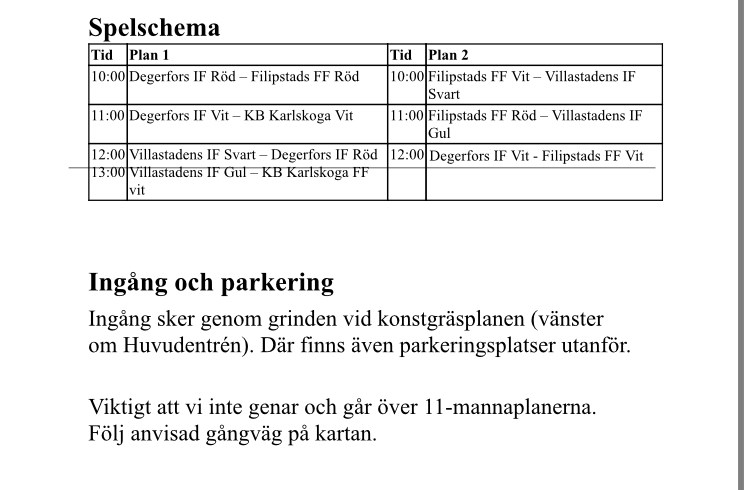 Hej!? Vi kommer att spela med två lag i Degerfors på söndag, svart och gult. Båda lagen spelar två matcher. Se bifogad bild samt appen Min Fotboll. Svarta laget samlas vid Pekås 8:30 på söndag 15/6. Följande spelare ingår i svarta laget: Selma, Olle, Rafael, Hampus, Olivia, Wilton, Vilgot, Otto, Arvid och Hjalmar. Gula laget samlas vid Pekås 9:30 på söndag 15/6. Följande spelare ingår i gula laget: Wilmer, William, John, Tora, Sigrid, Oskar, Elton, Otso, Wille och Eliias. Medtag fotbollsskor, benskydd, vattenflaska, matsäck och handduk.
