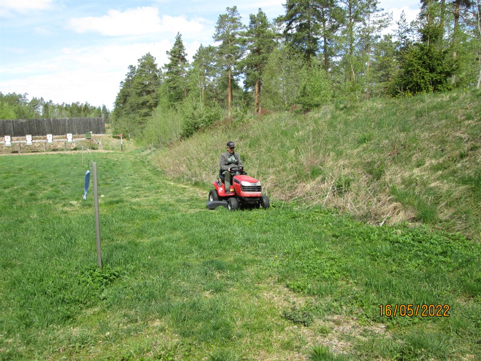 Vi fick intresserade nyfikna på korthållsskytte från Horn, Frödinge, Bellö, Vena, Pelarne m.m. Vi hoppas att vi får nya medlemmar till vår förening i Vimmerby. Bilden Tomas Johansson (Skyttechef) klipper gräsmattan efter skyttet.