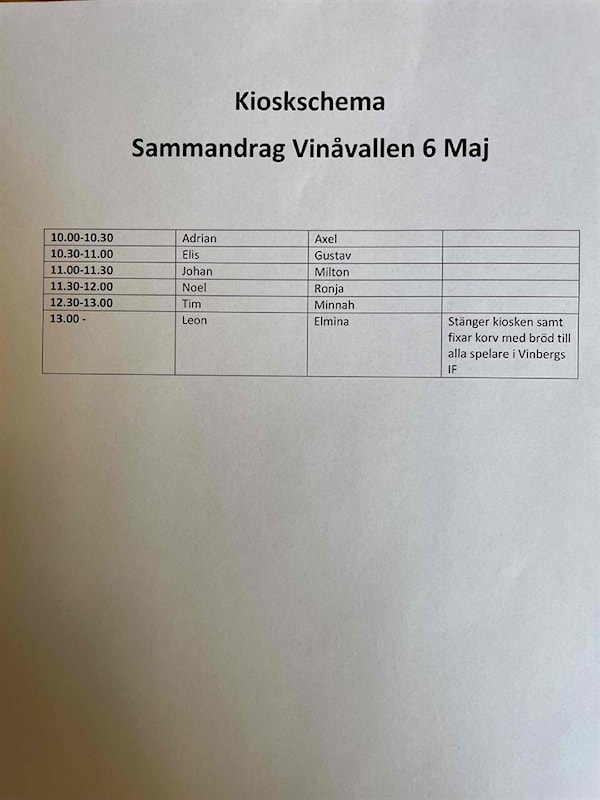 Här kommer kioskschemat för morgondagen. Kom gärna till kiosken 5 minuter innan för genomgång/överlappning.