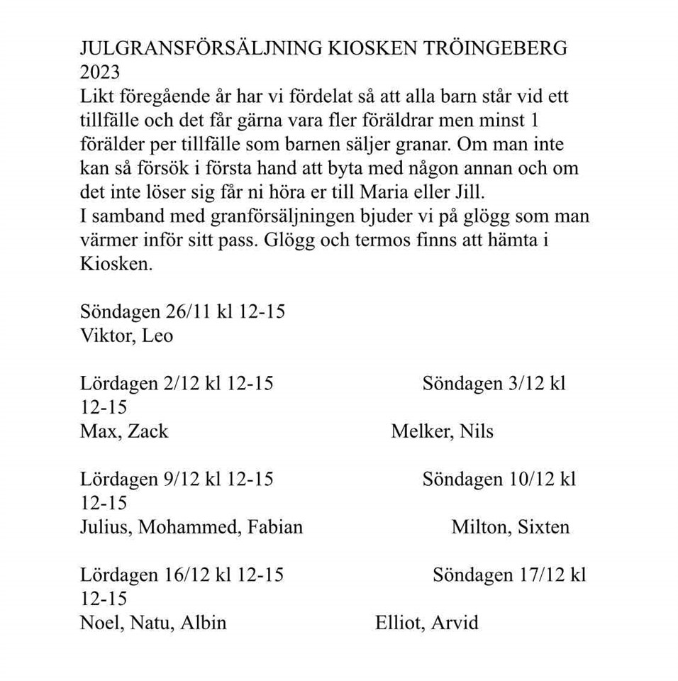 Så är det dags att sälja gran igen. Vi drar igång nu på söndag. Se bifogat schema. P-2011 24 nov 2023 0kommentarer