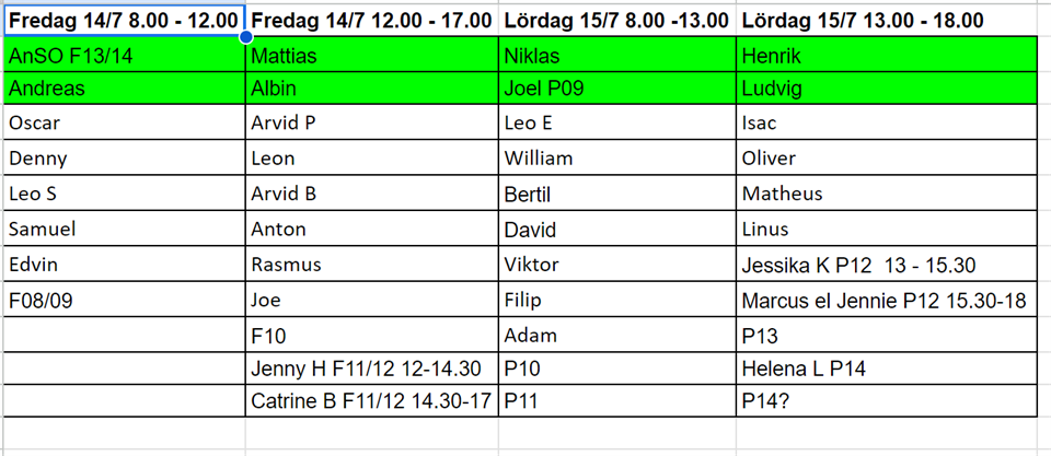 Hej! Här kommer viktig info till er som ska jobba på Wheels and wings i helgen. Ni har blivit tilldelade ett pass, ni ska stå i ett tält och hjälpa till med att sälja mat. Det är bra om ni är på plats på motorbanan 15 min innan ni ska gå på ert pass. För att komma in på området så behöver ni ett armband, det får ni av Andreas, Albin, Niklas eller Henke (ledare i U-laget) när ni kommer dit. Om ni kör bil dit så behöver ni även ett parkeringsbevis. Det får ni också när ni kommer. När ni kör till motorbanan och kommer från Ljungbyskolan så svänger ni ner vänster innan den stora entrén (där cruisingbilarna kör ut från motorbanan). Där har de sagt att vi kan parkera (vi får se hur det blir med det). Vi kommer att stå och dela ut armbanden och parkeringsbevis utanför stora entrén (där är en byggnad en bit bort, leta efter någon i Vinbergs tröja så löser det sig). Det kommer vara extremt mycket trafik så jag föreslår att ni tar er dit på annat sätt än med bil och räkna med att det tar extra lång tid i trafiken så var ute i mycket god tid. Jag lägger med det senaste uppdaterade schemat. Vi ses i helgen!