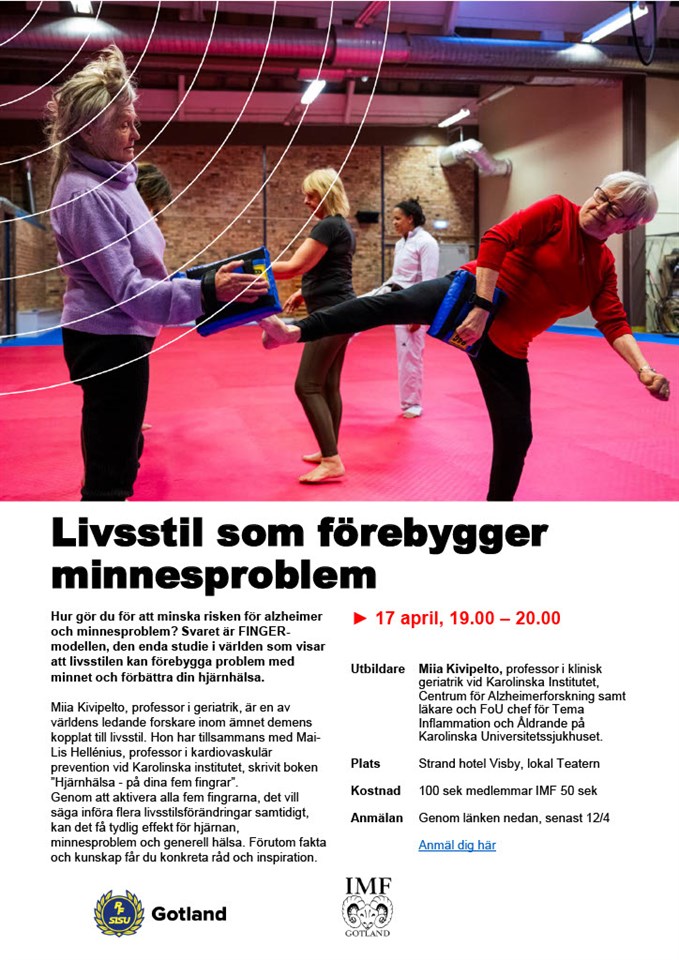 Hur gör du för att minska risken för alzheimer och minnesproblem? Svaret är FINGER-modellen, den enda studie i världen som visar att livsstilen kan förebygga problem med minnet och förbättra din hjärnhälsa. Miia Kivipelto, professor i geriatrik, är en av världens ledande forskare inom ämnet demens kopplat till livsstil. Hon har tillsammans med Mai-Lis Hellénius, professor i kardiovaskulär prevention vid Karolinska institutet, skrivit boken ”Hjärnhälsa - på dina fem fingrar”. Genom att aktivera alla fem fingrarna, det vill säga införa flera livsstilsförändringar samtidigt, kan det få tydlig effekt för hjärnan, minnesproblem och generell hälsa. Förutom fakta och kunskap får du konkreta råd och inspiration. Föreläsningen hålls på Strand Hotell i Visby, lokal Teatern. Kostnad: 100 sek, 50 sek för medlemmar i IMF Vid frågor, kontakta: Emma Gustafsson, RF-SISU Gotland på emma.gustafsson2@rfsisu.se Varmt välkomna! https://educationwebregistration.idrottonline.se/Home/Index/1889782