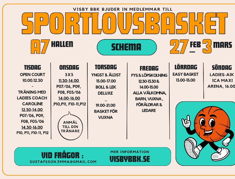 Sportlovshäng i A7! Ta chansen att få spela 3x3 på onsdagen. Anmäl er till oss ledare så förmedlar vi vidare! V. 8 träning som vanligt. V.9 Onsdagsträning uteblir. Söndagen uteblir också. Finns möjlighet till att träna basket hela veckan Flickor 10-11 18 feb 2024 0kommentarer