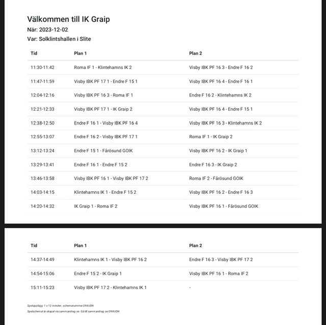 Hej på er! Nu på lördag 2/12 är det dags för Knatteligan. Vi kommer spela i Solklintshallen i Slite. I Knatteligan spelas matcherna tre mot tre utan målvakt och varje match är 1 x 12 minuter. Vi har anmält två lag, Visby IBK PF17. Samlingstid och lagindelningen hittar ni nedan. Lag 1: Samling 11:20, första matchen 11:47. Ledare:Johan, Jocke & Marcus N Adrian Olle Sigge William W Viggo Vin Lag 2: Samling 13:20, första matchen 13:46 Ledare: Tobbe & Marcus B Billy Ludvig Walter Valder Ebbe Bruno Melker Har man fått förhinder, meddela oss ledare snarast. Eller om vi har glömt någon.