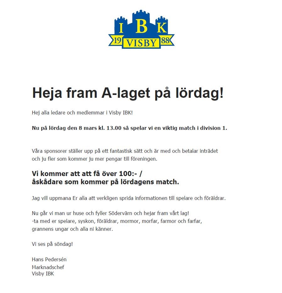 Glöm inte att vi på lördag agerar maskotar till A-laget! (samling 16:15 Södervärn) Ta med släkt, vänner och alla du känner så hejar vi fram killarna till en tredje och avgörande kvalmatch... NU gäller det....... Väl mött // ledarna Visby IBK P-05 Herrar B 18 mar 2014 0kommentarer