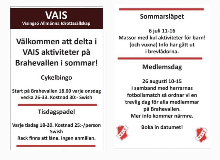 Missa inte våra aktiviteter i Juli! Kanske dyker det upp fler. Håll utkik på hemsidan eller på vår sida på Facebook. Visingsö AIS 26 jun 2023