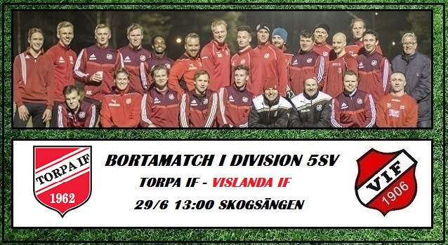 Helljarye som en sann Vislanda legendar hade sagt! Här håller vi på att glömma att göra reklam för morgondagens bortamatch mot Torpa. Nåja..bättre sent än aldrig. Bortamatch i division 5 imorgon 29/6, Torpa - Vislanda IF. En färsk 3:a på kontot mot Angelstad i förra omgången, vi siktar på att följa upp den insatsen med en likabra match mot svårspelade Torpa. Redan 13:00 drar vi igång på Skogsängen, kom och stötta oss på plats.. Om ni inte har vägarna förbi så önskar vi alla en riktigt bra sommar!!
