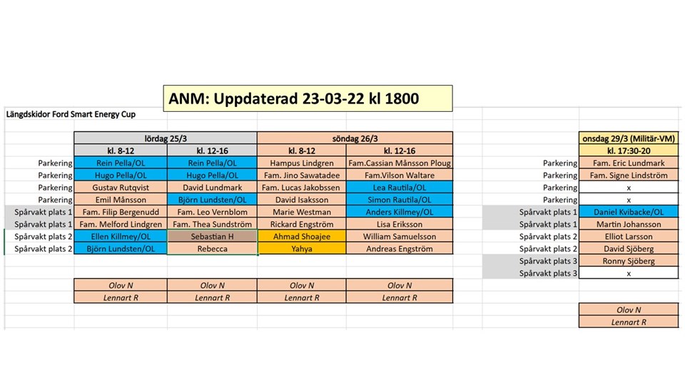 Lördag 25/3, söndag 26/3 och onsdag 29/3 behöver WIK funktionärer i samband med skidtävlingar i Pagla. Uppgiften består i att vara parkerings- eller spårvakt. Passen är mellan 08-12/12-16 lördag och söndag samt 17:30-20:00 onsdag (se bilden). Vi delar passen mellan orienteringen och fotbollen, fördelning enligt anmälan. Anmäl möjlighet att ta ett pass genom att skriva en kommentar nedan ex: För- och efternamn, datum, tid och uppgift. Sammanställning delges senare. Uppdatering 23-03-19: Tack ni som hunnit anmäla er. Alla vi andra ovan bild utvisar aktuell bemanning. Fotbollen kommer med ca 15 personer. Uppdaterar bilden så snart det är klart dock kan vi konstatera att vi behöver mer folk – passa på att anmäla er. Mvh Styrelsen Orientering 15 mar 2023 10kommentarer