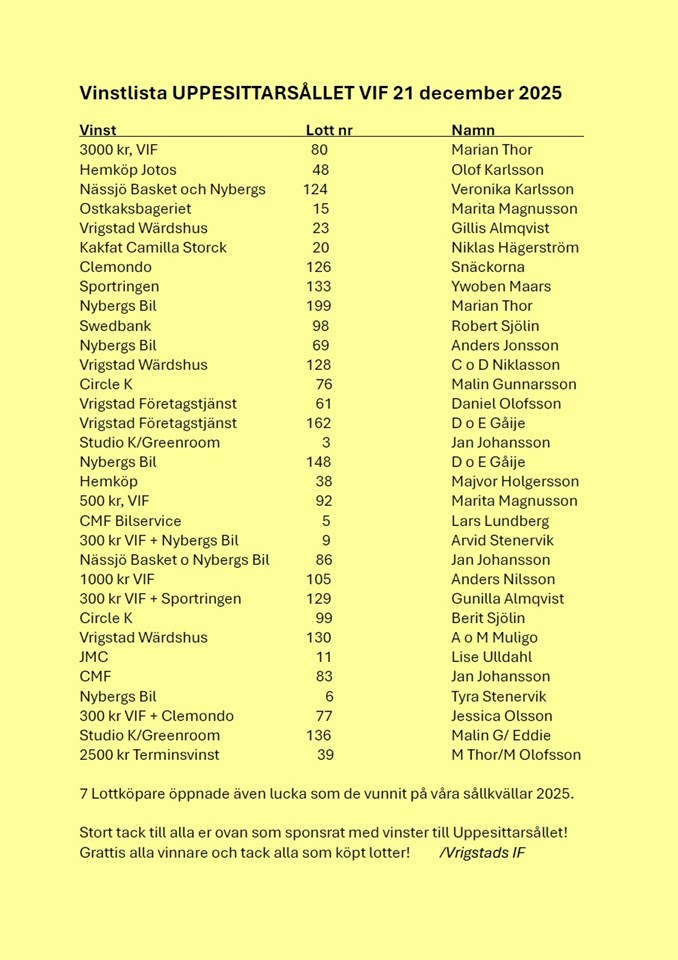 Klicka på bekräftelselänken i det mejl vi skickat dig för att börja ta emot uppdateringar från Vrigstads IF Lotteri-Eventgrupp.