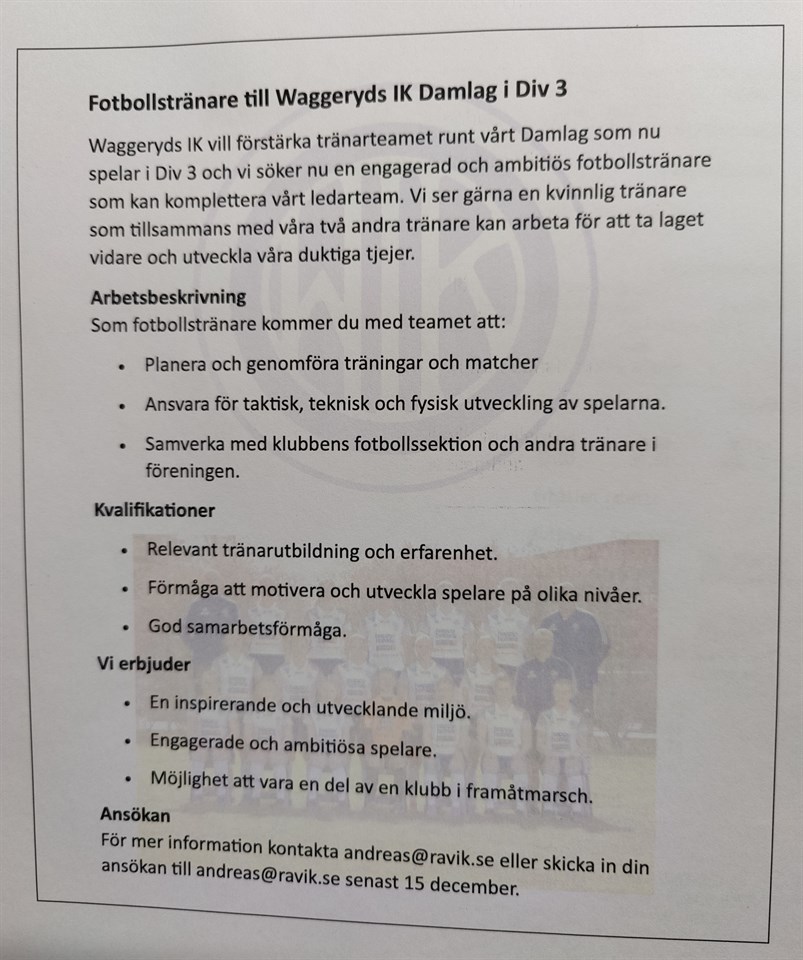 Fotbollstränare till Waggeryds IK Damlag i Div 3 Waggeryds IK vill förstärka tränarteamet runt vårt Damlag som nu spelar i Div 3 och vi söker nu en engagerad och ambitiös fotbollstränare som kan komplettera vårt ledarteam. Vi ser gärna en kvinnlig tränare som tillsammans med våra två andra tränare kan arbeta för att ta laget vidare och utveckla våra duktiga tjejer. Arbetsbeskrivning Som fotbollstränare kommer du med teamet att: • Planera och genomföra träningar och matcher • Ansvara för taktisk, teknisk och fysisk utveckling av spelarna. • Samverka med klubbens fotbollssektion och andra tränare i föreningen. Kvalifikationer • Relevant tränarutbildning och erfarenhet. • Förmåga att motivera och utveckla spelare på olika nivåer. • God samarbetsförmåga. Vi erbjuder • En inspirerande och utvecklande miljö. • Engagerade och ambitiösa spelare. • Möjlighet att vara en del av en klubb i framåtmarsch. Ansökan För mer information kontakta andreas@ravik.se eller skicka in din ansökan till andreas@ravik.se senast 15 december.