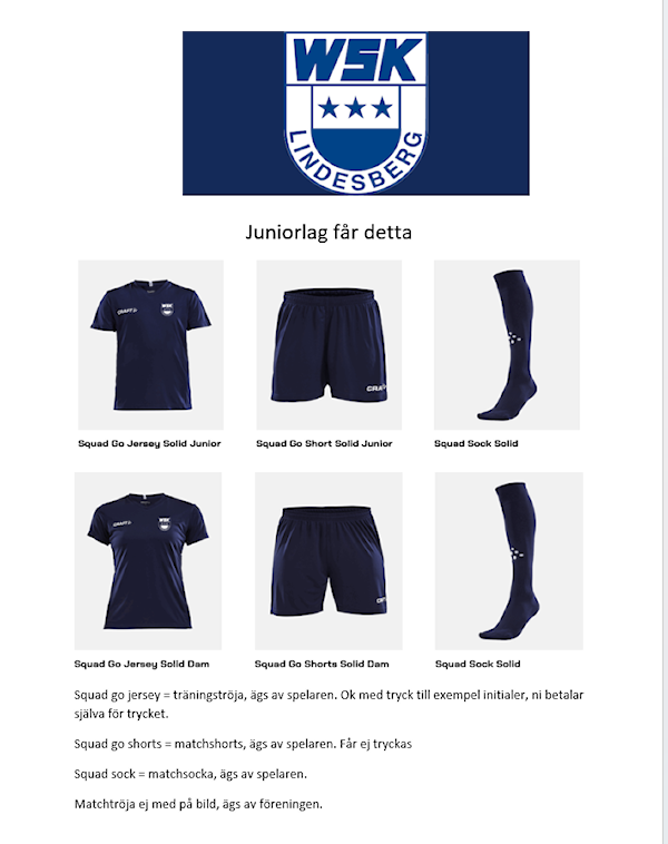 Föreningen kommer stå för en uppsättning av t-shirt, shorts och strumpa. Det finns vissa förbehåll vad det gäller tryck, se bifogad bild. Har ni inte möjlighet att delta under föreningskvällen beställer ni era kläder i den fysiska butiken eller på vår föreningssida https://www.skyddsgrossisten.se/foreningar/wsk/